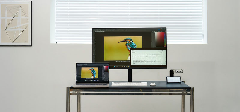 یکی از برجستهترین ویژگیهای ViewFinity S8، توانایی آن در پشتیبانی از چند کار همزمان با منابع ورودی مختلف است. صفحهنمایش گسترده این محصول، جایگزینی کامل برای دو مانیتور مجزا محسوب میشود و با قابلیتهای تصویر در تصویر (PIP) و تصویر کنار تصویر (PBP) نمایش همزمان محتوای دو دستگاه را در یک صفحه ممکن میسازد. وجود کلید سوئیچ داخلی KVM به کاربر اجازه میدهد تنها با یک کیبورد و ماوس، دو دستگاه متصل را به طور همزمان کنترل کند؛ قابلیتی که بهرهوری را افزایش داده و محیط کاری را منظمتر میسازد.